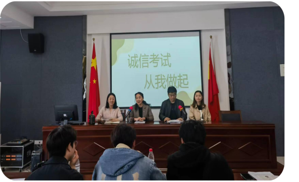 二是帮助考生端正考试态度。在考试的前一天,为端正考风、严肃考纪,营造文明、诚信的良好考试氛围,各班辅导员召开了以“诚信考试,从我做起”的主题班会。会上,辅导员们带领各班同学学习了《学校2023年专升本考试公告》,《国家教育考试违规处理办法》、《考生守则》等内容,向同学们讲解了关于考试作弊的危害,对他们的各项提问一一作了详细解答,同学们签了诚信考试的《承诺书》。党总支书记叶桦深入会场,对同学们进行了心理排解与精神鼓励,她亲切地叮咛大家要有平常心,在考前要放松心态,正确对待考试。会后,辅导员带着各班员工前往考场进行了现场演练。
