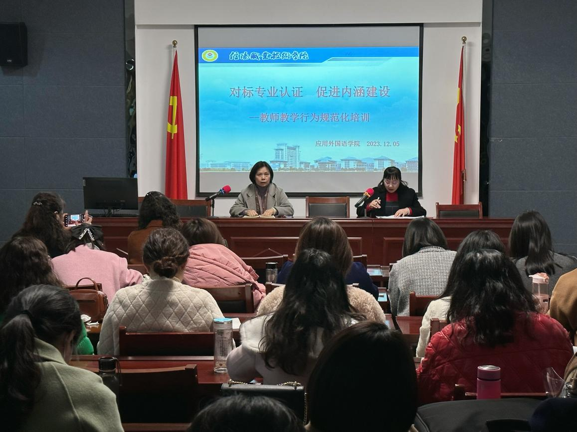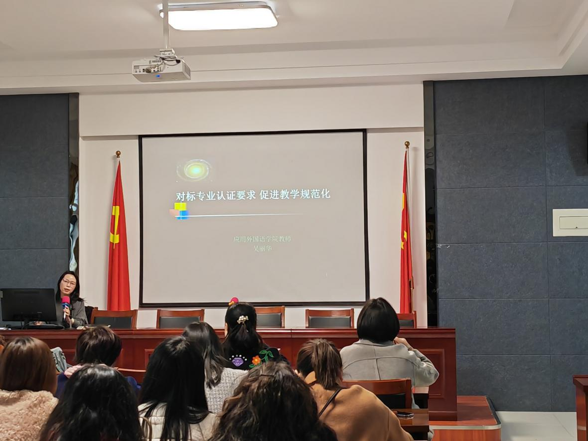 公共英语教研中心主任吴丽华进行了“对标专业认证要求,促进教学规范化”的专题培训,她首先简要介绍了二级师范专业认证的理念、“反向设计、正向施工”与课程体系及课程目标的逻辑关系,从教学大纲与人培方案、授课计划的撰写、教案规范化要素、试卷的命题、批阅与装订以及过程性考核材料的留存六个方面进行阐述和逐一梳理,指出了教师以往工作中容易忽视的问题并提出对应的解决策略。学院副经理刘文敏对学院教学要求做了强调和补充。最后,刘晓鹂对本次培训活动进行了总结讲话,提出将进一步规范教学工作、促进学院内涵建设,为今后工作开展拓宽思路、明确方向。