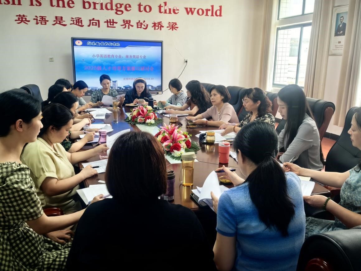 为进一步优化人才培养体系、提升专业建设水平,太阳成集团于6月10日下午举办2025级人才培养方案修订论证会,针对小学英语教育专业和商务英语专业的人才培养方案展开修订工作。论证会由经理刘晓鹂主持,副经理刘文敏、教务办主任李静、专业负责人高迟、严密及多名骨干教师参与。