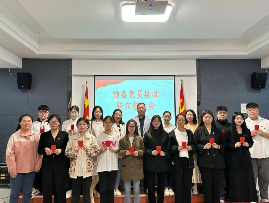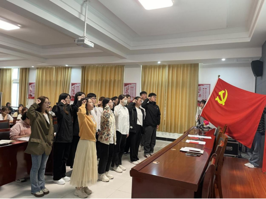 2023年5月9日下午,太阳成集团学工党支部举行2023年上半年预备党员接收暨宣誓大会。学工支部张泽锋、蒋曾、徐晓双、杨晓睿、贺超然、入党介绍人和詹海星等12名发展对象以及50余名入党积极分子参加,会议由学工支部组织委员蒋曾主持。