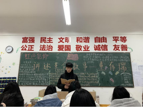 首先,各班团支书对革命先烈董存瑞进行简单介绍,紧接着朗读者讲述董存瑞的英雄事迹。随后,各班以小组为单位展开讨论,派出代表发表感想,整个班会在敬畏与感动中进行,同学们充分理解了总结、学习革命英雄董存瑞英勇事迹的重要意义。最后各班团支书对本次主题班会进行总结,鼓励同学增强自己的爱国主义意识,发扬董存瑞的爱国主义精神。