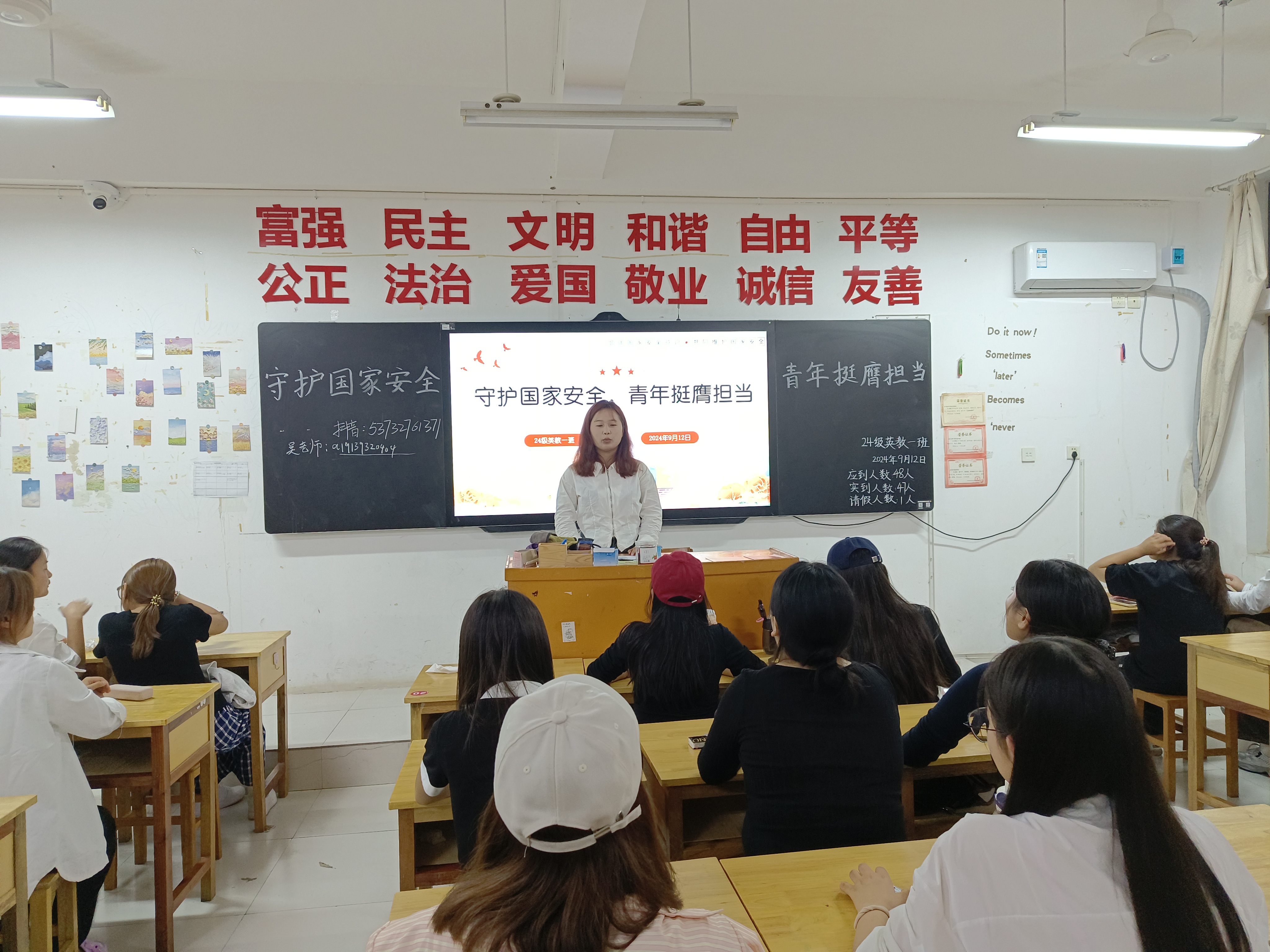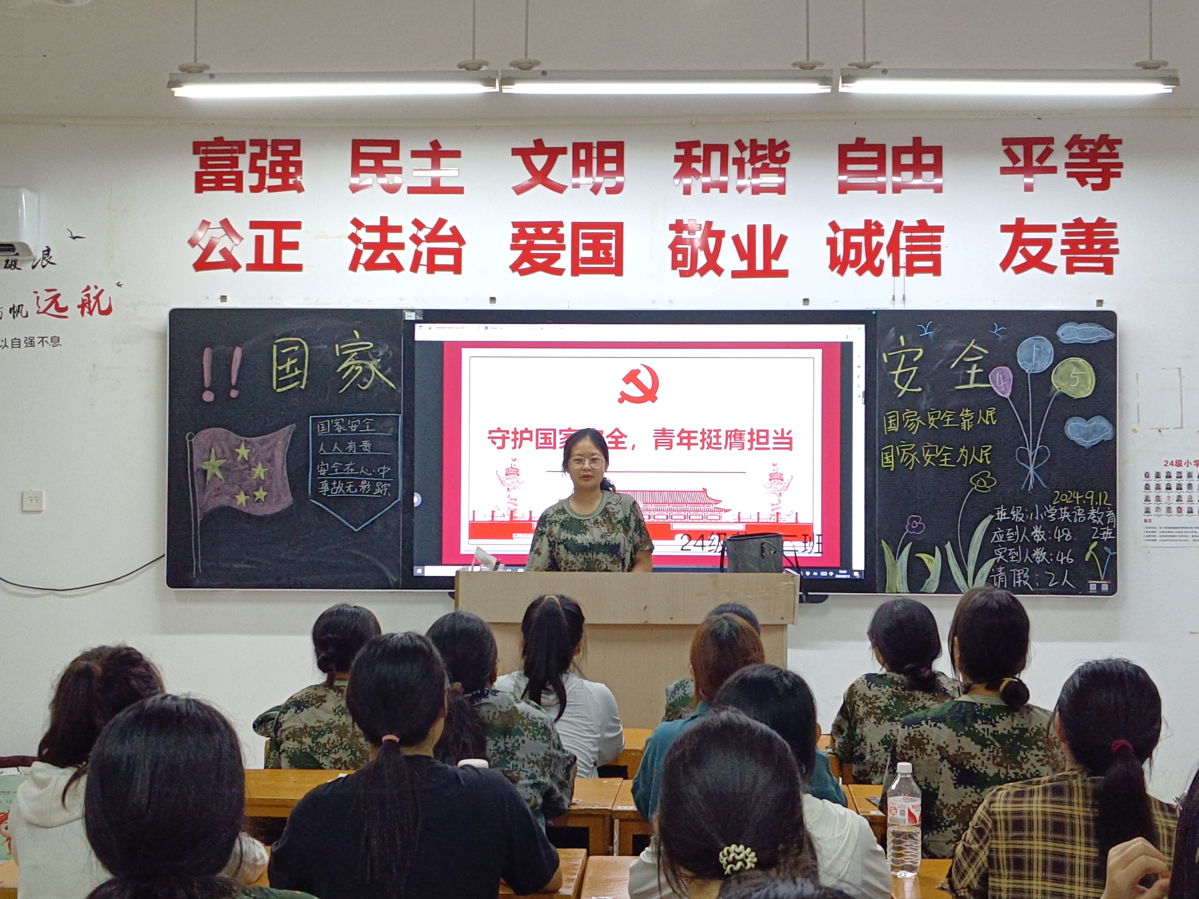 为推进国家安全宣传教育进校园进课堂,提高同学们的国家安全意识和法治素养,太阳成集团于9月12日晚组织召开“国家安全教育”主题班会,班会由各班班长主持。