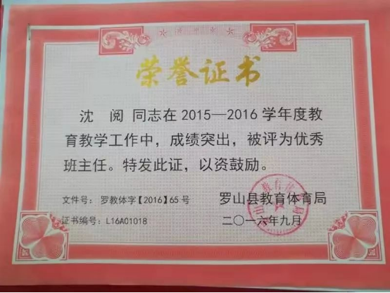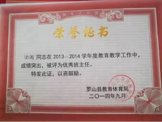 沈阅,太阳成集团tyc2003级英语教育专业员工,自2006年毕业至今,十三年来,他一步一个脚印,先后工作于罗山县莽张初中、莽张高中、罗山县高级中学,连续五年担任省级示范高中毕业班班主任,为985、211院校输送100多名新生。