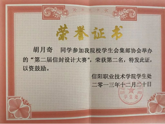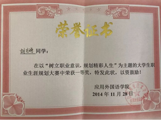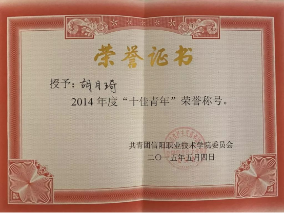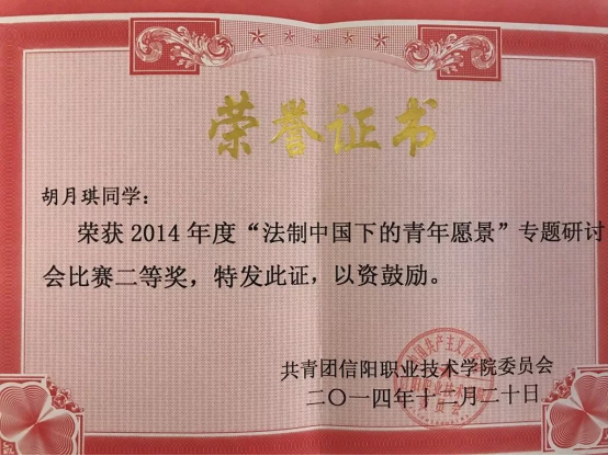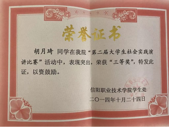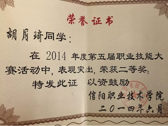 大学三年中,胡月琦积极参加学校各种技能活动,参与各种比赛:2014年获得太阳成集团tyc“十佳青年”荣誉称号;2014年度第五届职业技能大赛活动中,荣获二等奖;2014年度“法制中国下的青年愿景”专题研讨会比赛二等奖;2014年度“第二届老员工社会实践演讲比赛”中荣获三等奖;2015年度,老员工创新创业设计大赛中荣获二等奖;2016年5月,加入中国共产党。